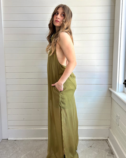 A collared halter-neck sleeveless maxi dress with a mini-length lining beneath a sheer maxi-length overlay featuring side slits. It has a front button closure, an open back design with an elastic band for support, and a relaxed, airy silhouette.